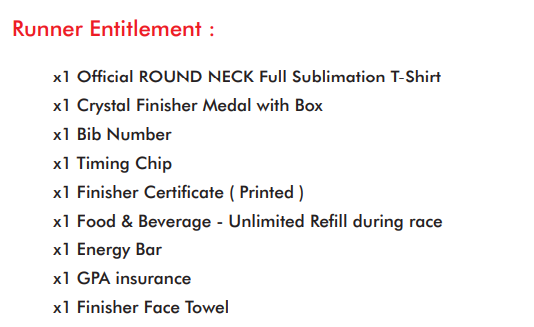 Participants are strongly encouraged to go for a medical examination and/or consult their medical practitioner prior competing in this event Only registered participants are allowed to participate in this event, no other person besides the registered participants can use the race bib to enter and run this event. Any person violates this rule will be DISQUALFIED and BANNED from future events.