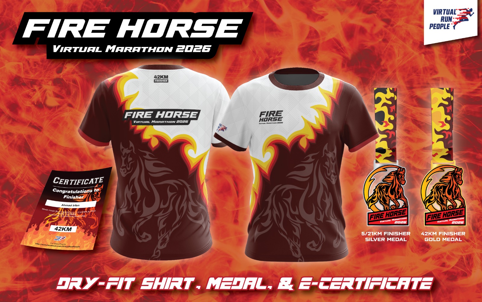 Fire Horse Virtual Marathon 2026 is organised by the Virtual Run People and it is open to participants with a valid mailing address in Malaysia and Singapore. For participants outside these regions, please contact us by email - FireHorse@VirtualRunPeople.com or WhatsApp us at +6016-380 7200.