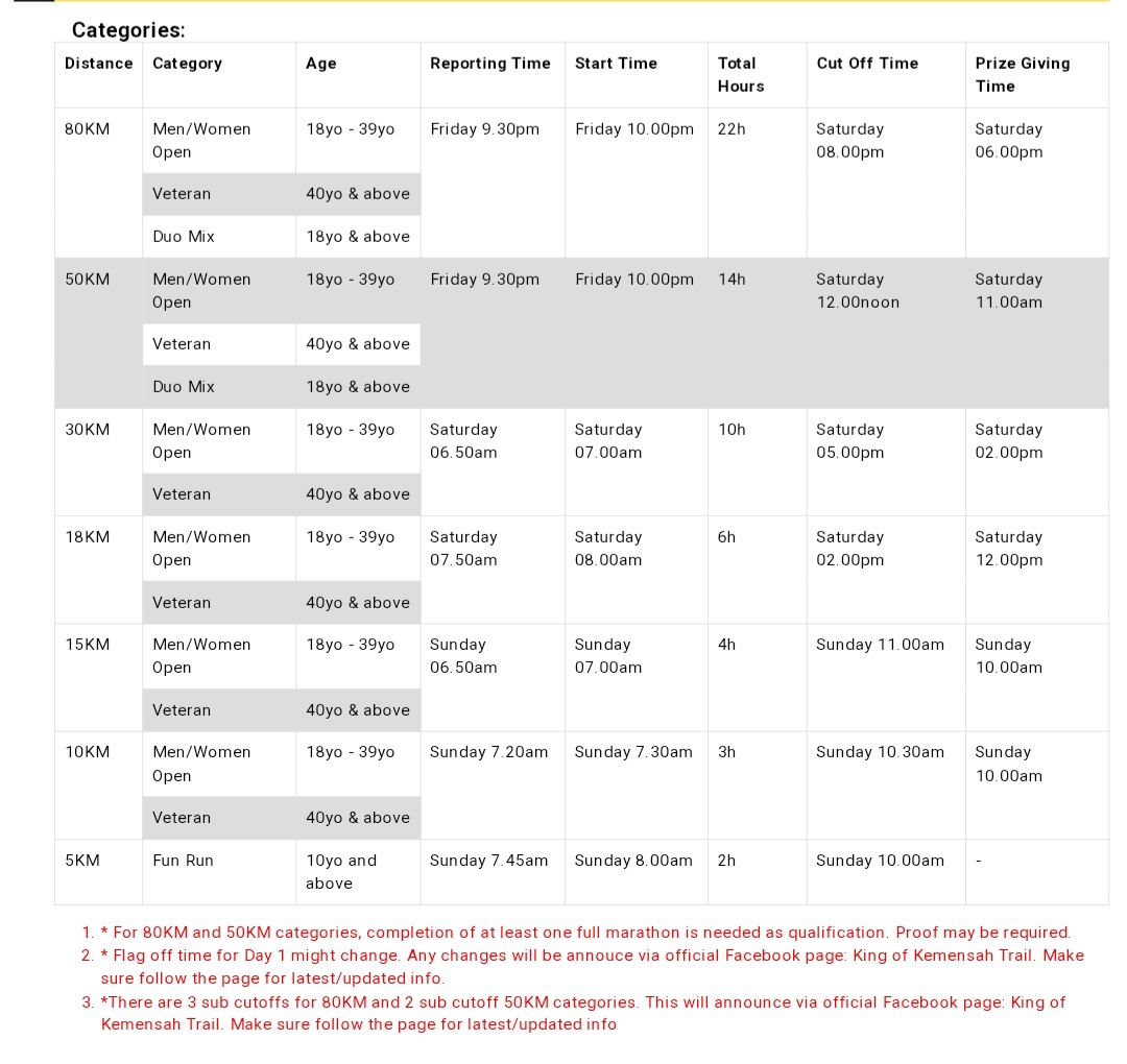 1. We will remain in the same categories: 50KM, 30KM, 18KM, 15KM, 10KM and 5KM.