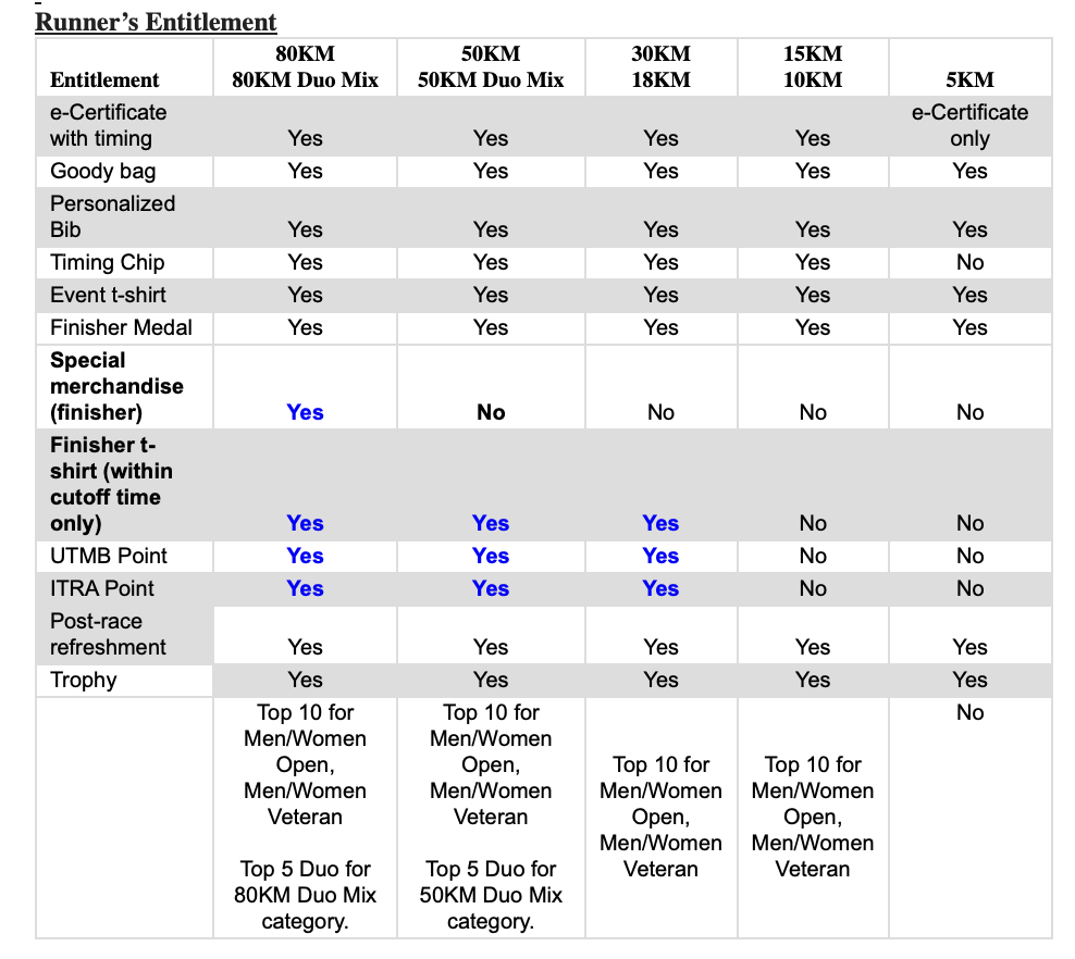 7. There are UTMB and ITRA points for 80KM, 50KM and 30KM categories.