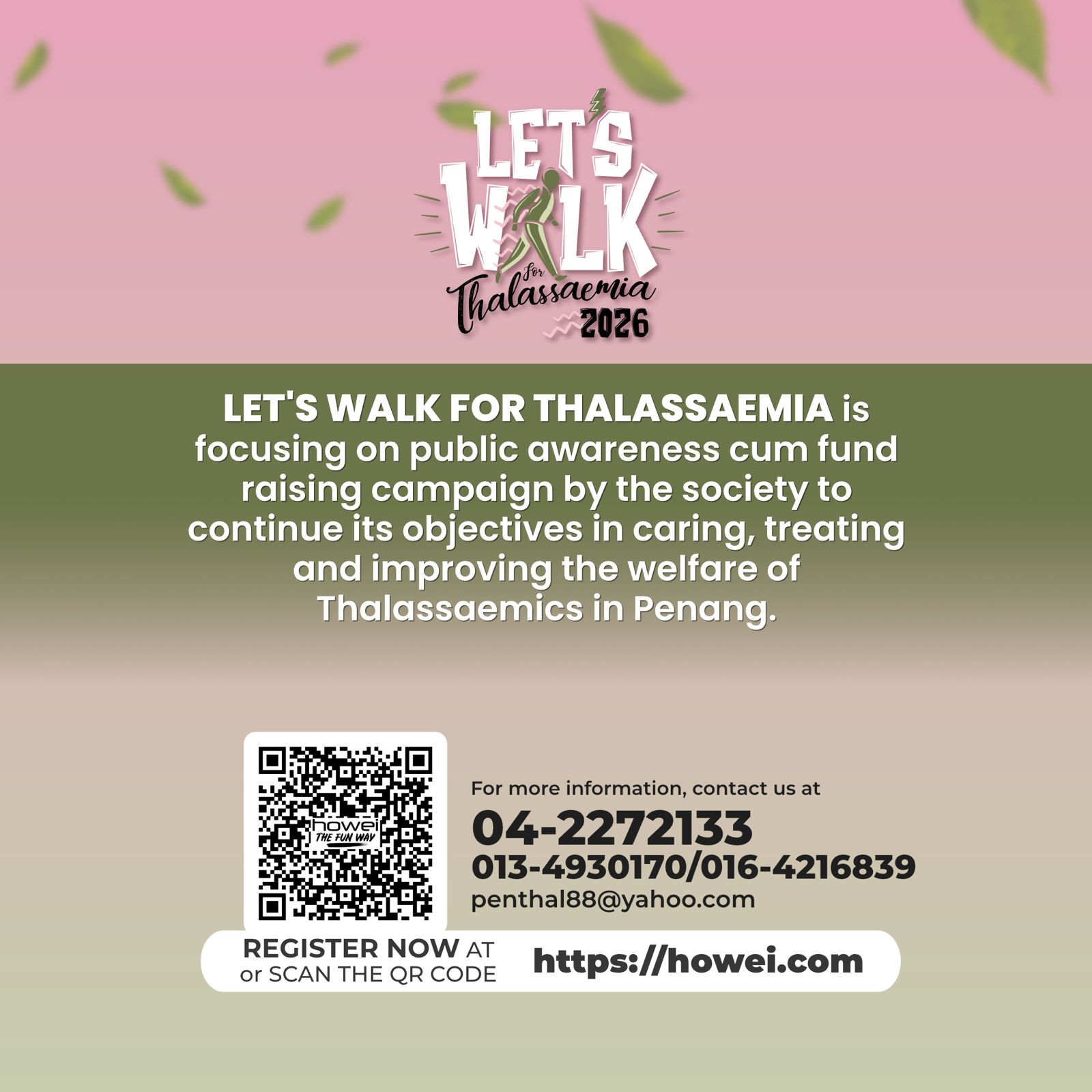 LET'S WALK FOR THALASSAEMIA is focusing on public awareness cum fund raising campaign by the society to continue its objctive in caring, treating and improving the welfare of Thalassaemics in Penang. Mark your calendar for the 13 September 2026- Let's Walk For Thalassaemia 2026 is going to be a grand, fun time! If you missed the previous Let's Walk For Thalassaemia, now is your chance to join. Get in now as limited slots are available!