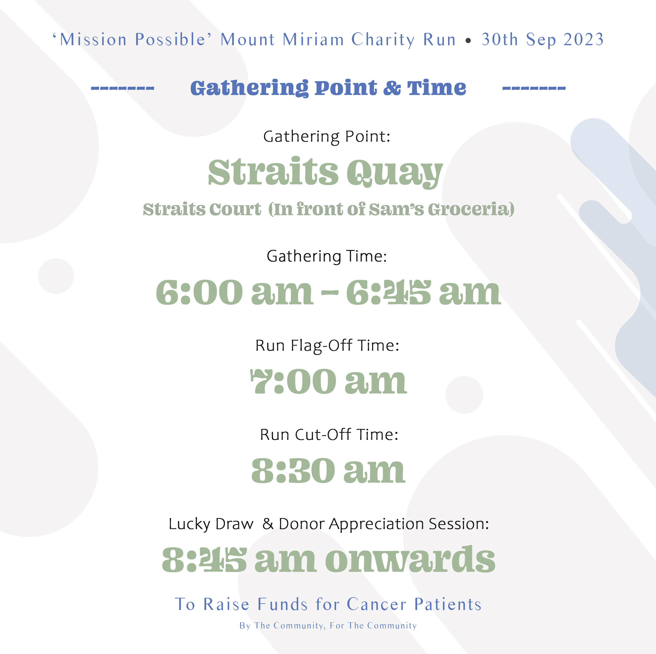 All proceeds received from this event will be donated to our Tabung Kebajikan Penyakit Kanser Mount Miriam to support the treatment cost of underprivileged cancer patients.
