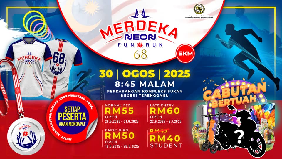 After careful consideration and in light of recent developments, we have decided to reschedule the event to ensure a more impactful and meaningful experience for all. The event will now take place as part of a new celebration – the Merdeka Neon Fun Run 68, happening on 30 August 2025, in conjunction with our nation's 68th Independence Day.
