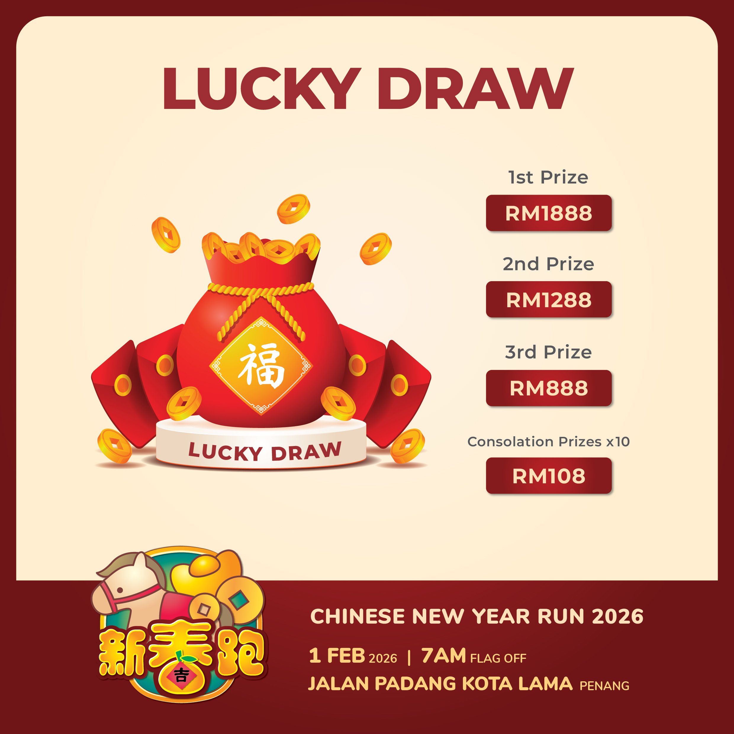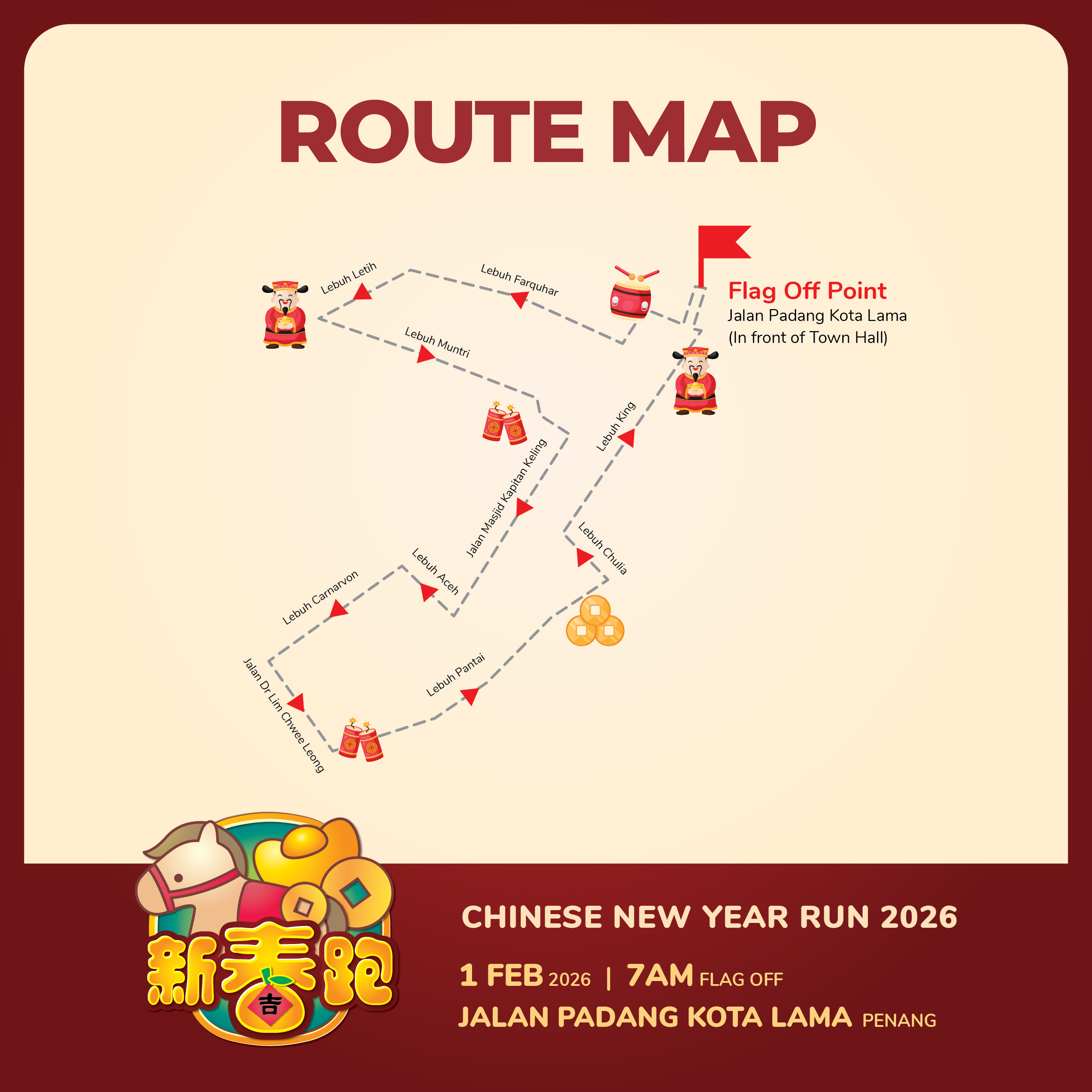 Celebrate the Year of the Horse in full festive spirit! Join us for a 5KM fun run across George Town World Heritage Site and soak in the vibrant red energy of Chinese New Year!
